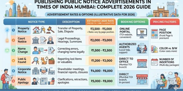 Planning to publish a public notice in Times of India Mumbai? This definitive guide breaks down verified 2026 public notice advertisement rates for Times of India Mumbai, explains the booking process step by step, and shares proven strategies to reduce…