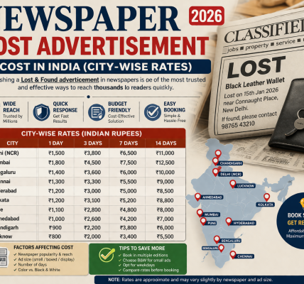 | Newspaper ads (2 papers, basic classified) | ₹1,000–₹5,000 (metros higher) |