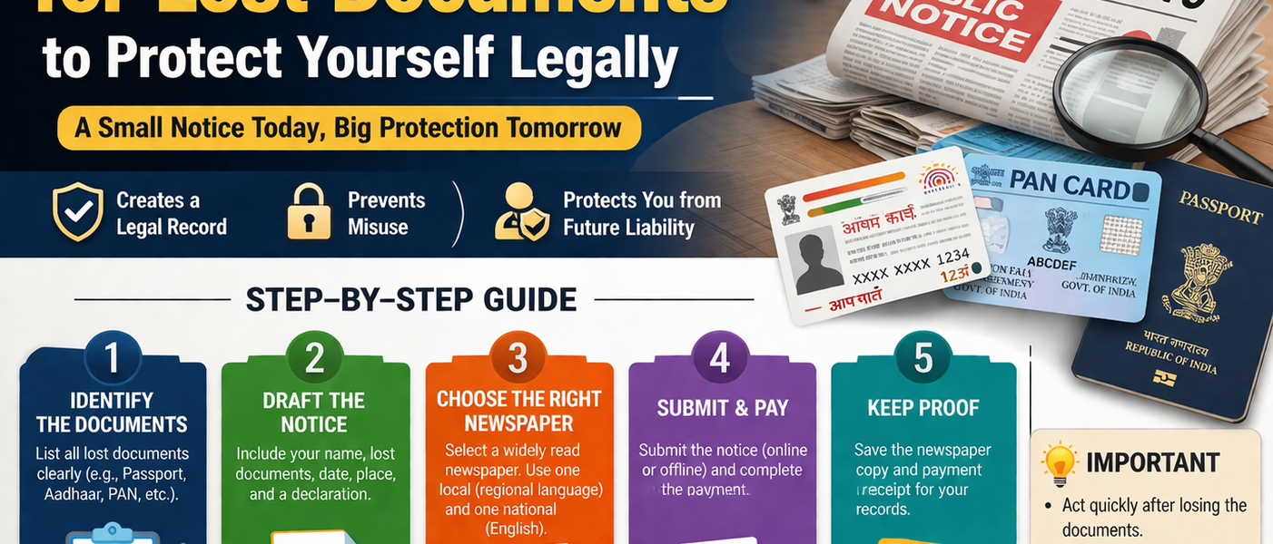 In case you have lost a crucial document — an RC book, a property agreement, a driving licence — one of the first actions your bank, RTO, or housing society will insist on is a lost document ad in the newspaper. Not as a formality. As proof that you made the loss public.