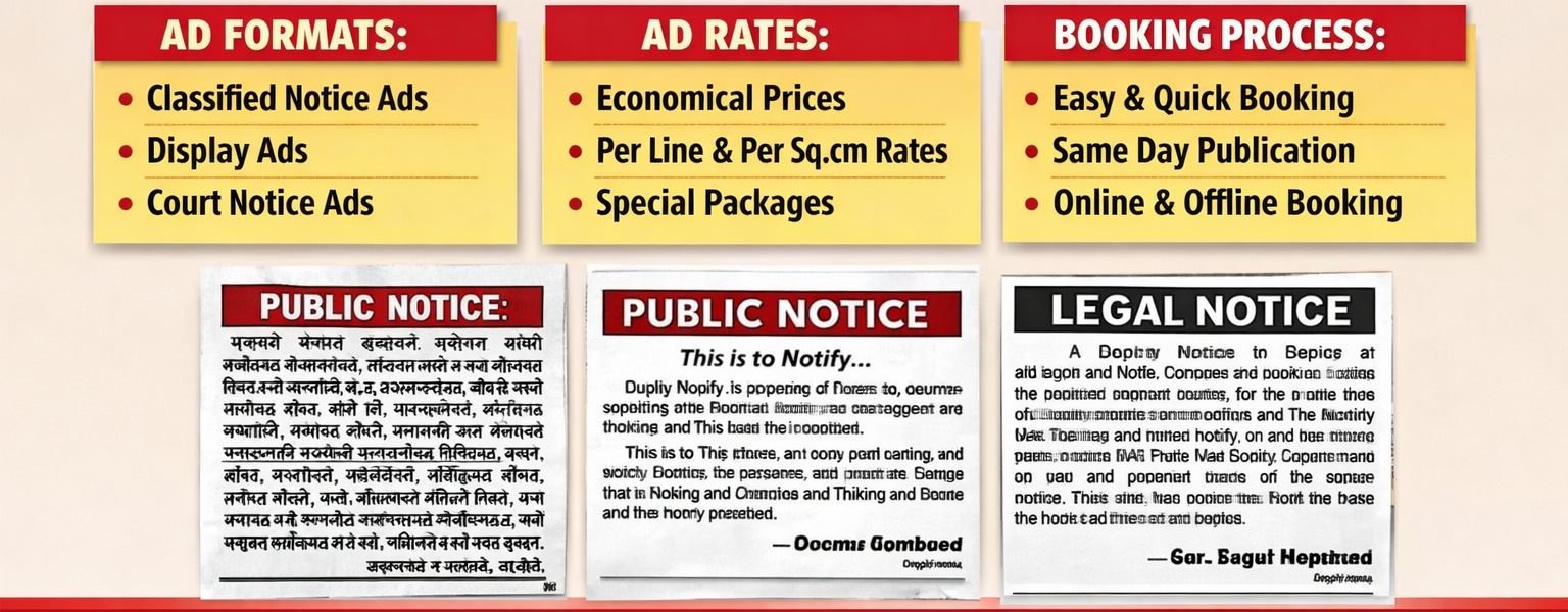 A Loksatta public notice advertisement is a statutory ad in Marathi used for legal communication such as name change, property notice, court summons, and company notices. It is accepted by courts, banks, and government authorities in Maharashtra.